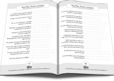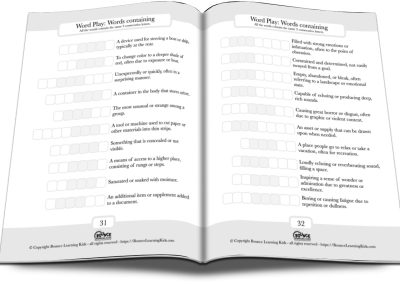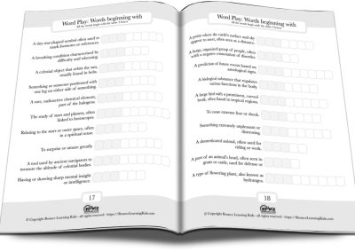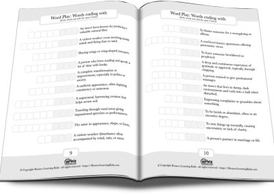 There are 10 words to be identified in each page. Each word has the same group of 3 or more letters in common, either at the beginning, end or in the middle of the word. Each word has a hint to help guide you. Identify the letters that are common between all ten words and you’ll be able to quickly find the remaining words.